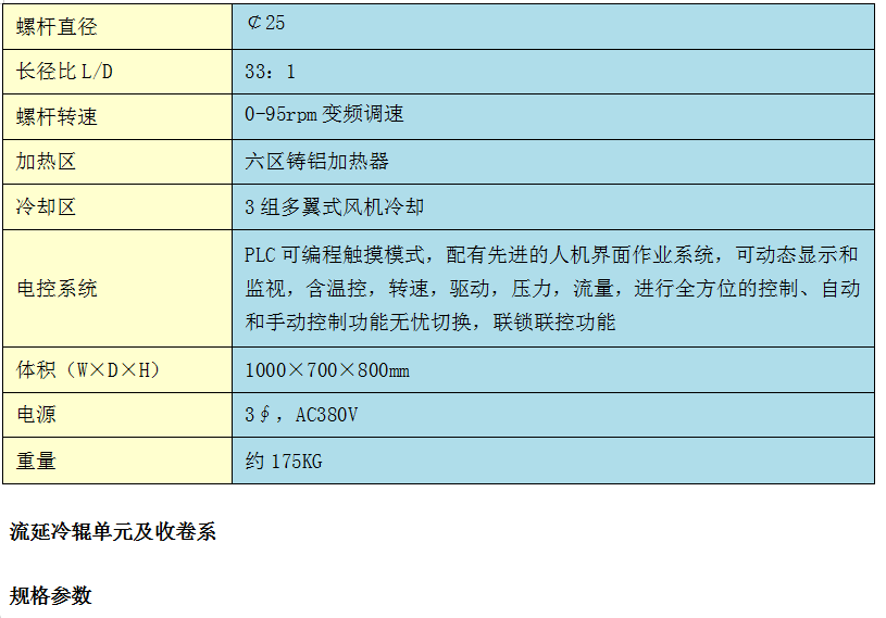 本機(jī)主要由主驅(qū)動(dòng)電機(jī)、傳動(dòng)裝置、擠出裝置、加料斗、電控系統(tǒng)、流延模頭、兩輥壓延等組成.